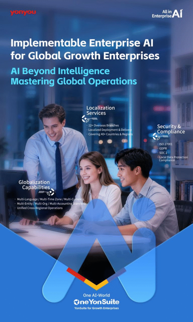 Yonyou YonSuite là nền tảng số – trí tuệ tích hợp hàng đầu thế giới dành cho các doanh nghiệp tăng trưởng, với cách tiếp cận “Sáu One”, đưa AI doanh nghiệp thực sự đi vào hoạt động vận hành hằng ngày — giúp AI × dữ liệu × quy trình hợp nhất thành một thể thống nhất, từ đó hiện thực hóa đúng nghĩa “AI doanh nghiệp trong tầm tay”.